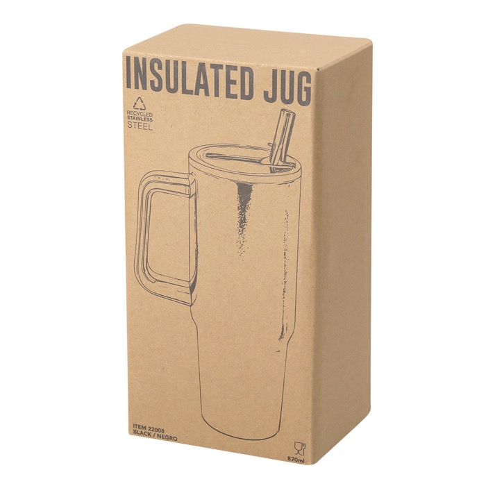 Botella térmica de 870 ml fabricada en acero inoxidable reciclado. Su diseño de doble pared asegura que las bebidas se mantengan calientes hasta 3 horas y frías hasta 6 horas, ideal para mantener la temperatura adecuada durante reuniones o eventos. La tapadera hermética con boquilla plegable facilita el consumo directo, mientras que el asa ergonómica permite un transporte cómodo y seguro. Libre de BPA, esta botella es una opción sostenible y segura para el entorno laboral. Perfecta para empresas que buscan soluciones prácticas y ecológicas para sus empleados o como parte de un kit de bienvenida corporativo.