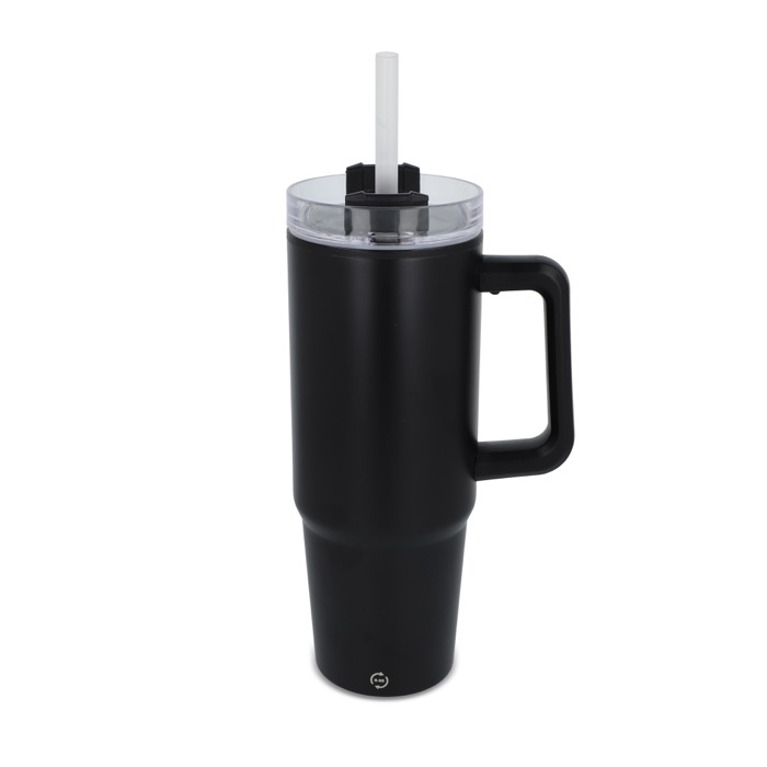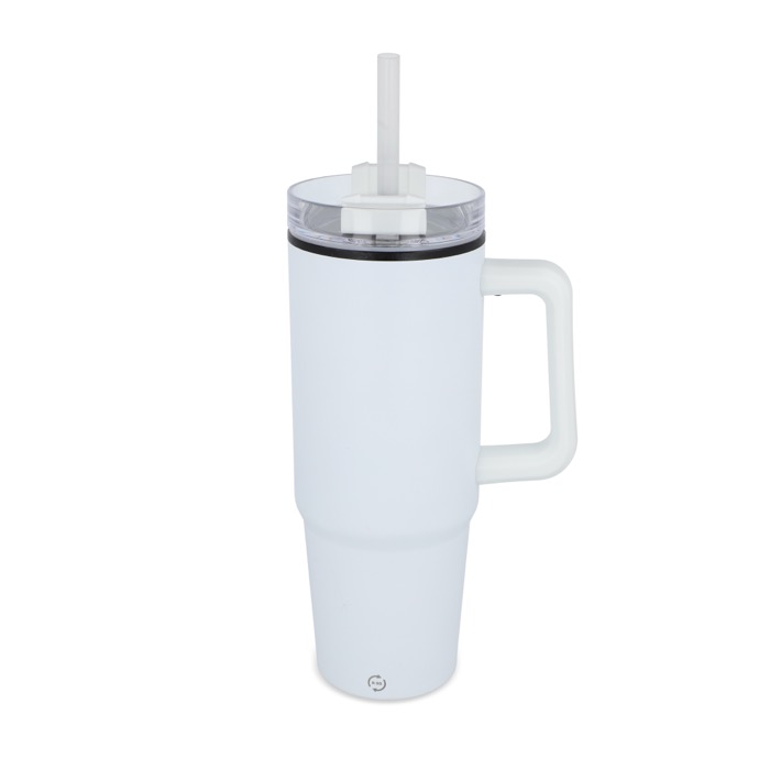 Taza aislada de 800 ml fabricada en acero inoxidable, con un interior de plástico reciclado que asegura durabilidad y sostenibilidad. Su diseño moderno y elegante se complementa con una base estrecha, ideal para encajar en la mayoría de los portavasos de automóviles, facilitando su uso en desplazamientos. Incluye un asa ergonómica y una pajilla, ofreciendo comodidad y practicidad para disfrutar de bebidas durante el día. Perfecta para empresas que buscan productos funcionales y sostenibles, esta taza puede ser utilizada en eventos corporativos o como parte de un kit de bienvenida para empleados.
