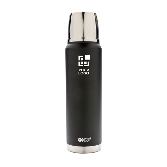 Termo Swiss Peak de acero inoxidable 18/8 con aislamiento al vacío y doble pared. Su elegante color negro con recubrimiento en polvo asegura durabilidad, evitando desgaste y grietas. La pared interna chapada en cobre maximiza la conductividad, manteniendo las bebidas calientes por 8 horas y frías por 24 horas. Con capacidad de 1 litro, es lavable a mano y cuenta con un diseño antigoteo. Se entrega en bolsa de plástico y caja individual. Ideal para empresas que buscan ofrecer a sus empleados o clientes un producto práctico para actividades al aire libre o eventos corporativos.