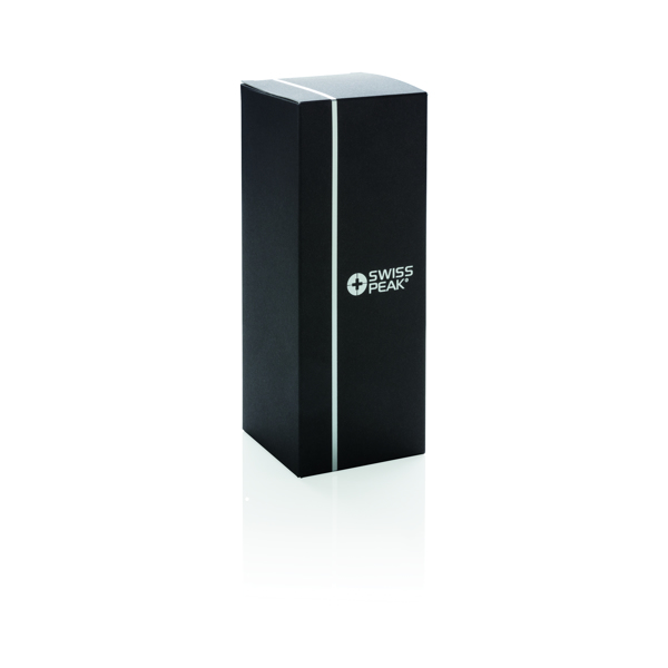 Termo Swiss Peak de 300ml fabricado en acero inoxidable de 18/8 grados, con aislamiento al vacío y doble pared. Su elegante color negro con recubrimiento en polvo garantiza durabilidad, evitando desgaste y grietas. La pared interna chapada en cobre maximiza la conductividad, manteniendo las bebidas calientes hasta 8 horas y frías hasta 24 horas. La tapa bloqueable antigoteo asegura un transporte sin derrames. Se recomienda lavar a mano para preservar sus características. Ideal para empresas que buscan un producto funcional y duradero, perfecto para personalizar con el logo corporativo y utilizar en eventos o como regalo para clientes y empleados.