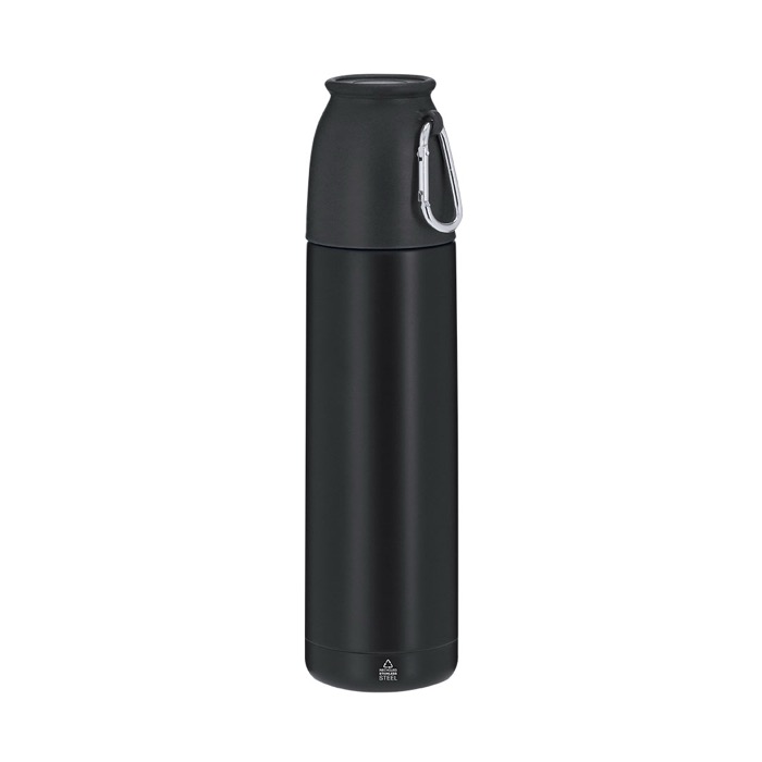 Set de termo con taza fabricado en acero inoxidable reciclado. El termo tiene una capacidad de 500 ml y cuenta con doble pared, lo que asegura una conservación óptima de la temperatura, manteniendo las bebidas calientes hasta 6 horas y frías hasta 15 horas. Incluye un dosificador de seguridad para un uso cómodo y seguro. La taza, con capacidad de 120 ml, se ajusta mediante rosca y viene equipada con un práctico mosquetón para facilitar su transporte. Ambos, termo y taza, presentan un elegante acabado mate a juego. Ideal para empresas que buscan soluciones sostenibles y prácticas para sus empleados en movimiento o como parte de un kit corporativo.