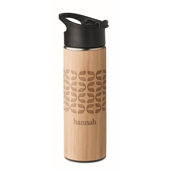 Botella de acero inoxidable de doble pared aislado al vacío, equipada con una tapa y asa de transporte en PP (polipropileno). Con una capacidad de 450 ml, esta botella es antifugas, asegurando que el contenido se mantenga seguro y sin derrames. La función térmica mantiene las bebidas a la temperatura deseada por más tiempo, ideal para mantener el café caliente o el agua fría durante la jornada laboral. El bambú, un material natural, aporta un toque único, aunque el color puede variar. Perfecta para empresas que buscan un artículo práctico y funcional, ideal para eventos corporativos o como parte de un kit de bienvenida para empleados.